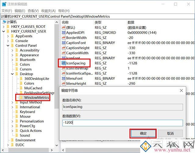 3.在注册表右侧窗口中,找到并双击打开IconSpacing的项(桌面图标水平间距),负数越大间隔就大,将数值数据修改为-1200。