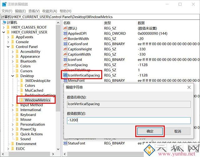 4.再找到并双击打开IconVerticalSpacing的项(桌面图标垂直间距),负数越大间隔就大,将数值数据修改为-1200。