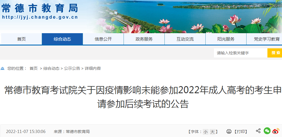 原文标题:常德市教育考试院关于因疫情影响未能参加2022年成人高考的考生申请参加后续考试的公告