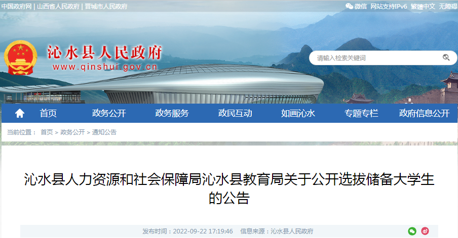 【#事业单位# 导语】2022山西晋城市沁水县人力资源和社会保障局沁水县教育局选拔储备大学生公告【160人】已发布。®文档大全网现将招聘公告原文发布如下: