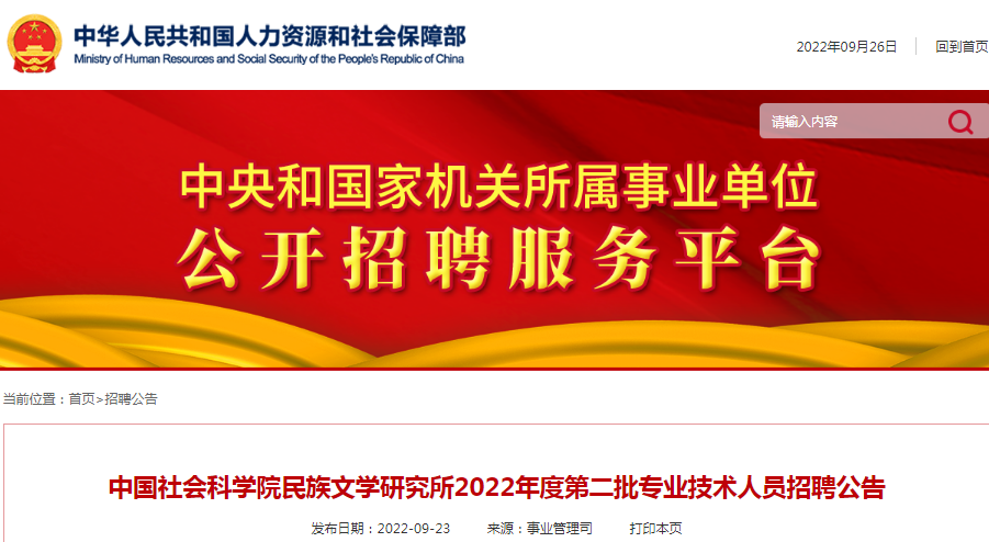 2022年度中国社会科学院民族文学研究所第二批专业技术人员招聘公告(北京)09-27