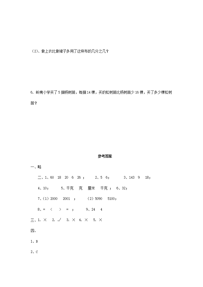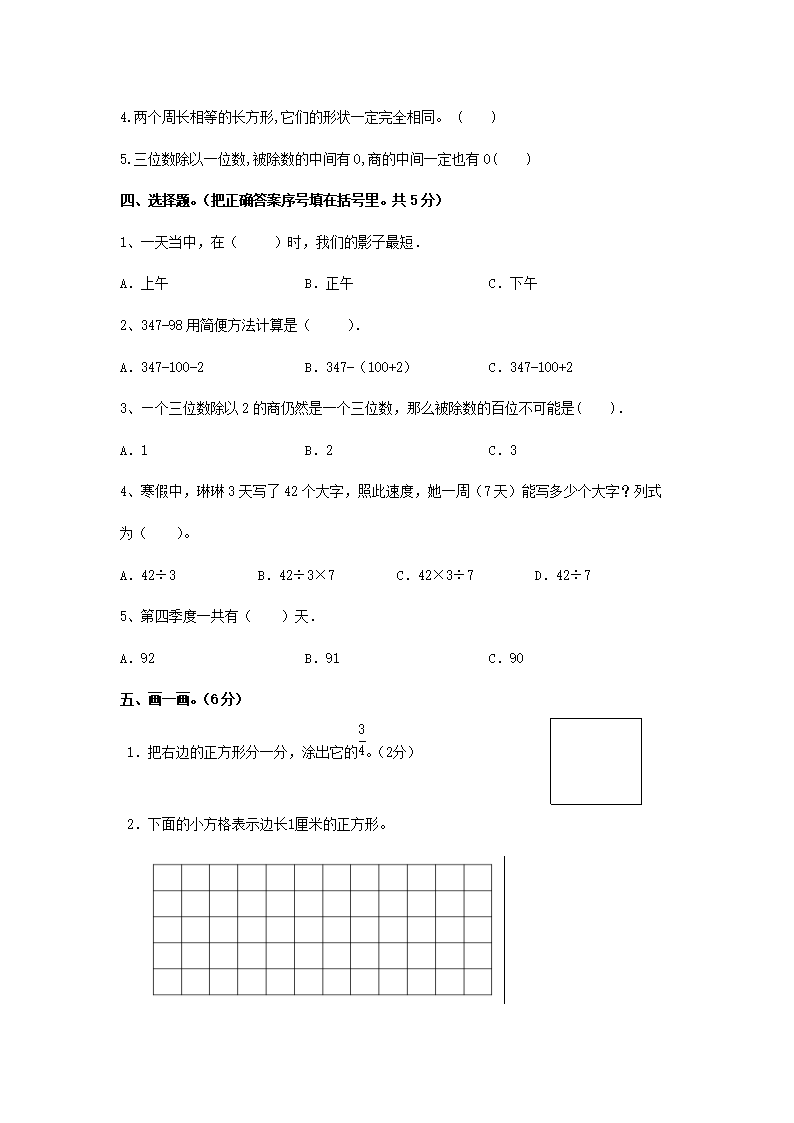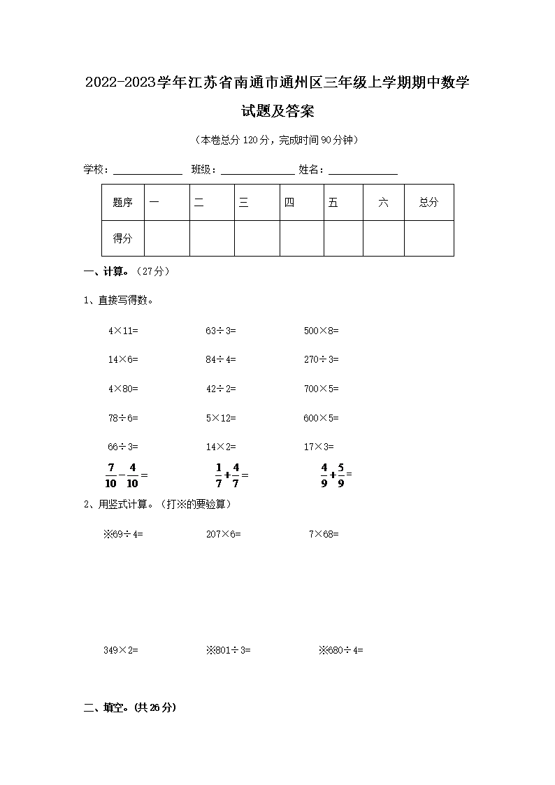 2022-2023学年江苏省南通市通州区三年级上学期期中数学试题及答案(Word版)07-29