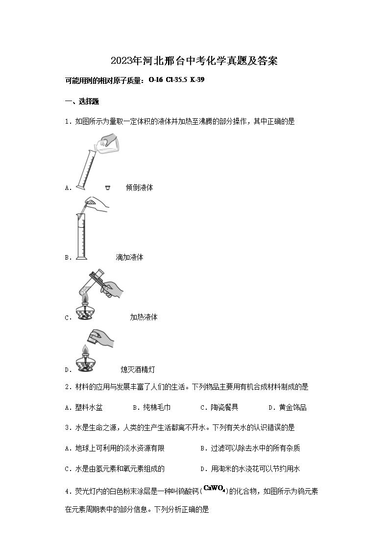 【文档预览】 文档大全网整理发布2023年河北邢台中考化学真题及答案(Word版),前五页预览如下: