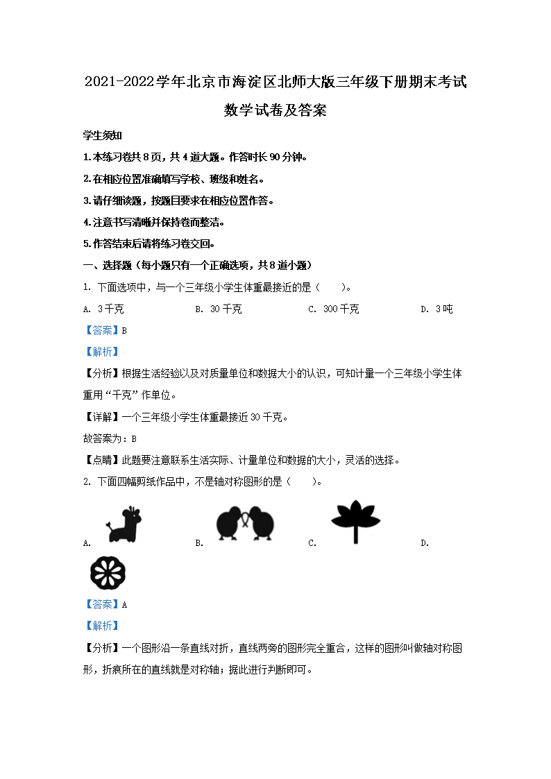 【文档预览】 文档大全网整理发布2021-2022学年北京市海淀区北师大版三年级下册期末考试数学试卷及答案(Word版),前五页预览如下:
