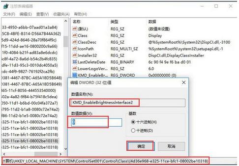 2、展开至HKEY_LOCAL_MACHINE\SYSTEM\ControlSet001\Control\Class\{4d36e968-e325-11ce-bfc1-08002be10318},将0000和0001中的KMD_EnableBrightnessInterface2的数据数值修改为0;(如果没有该键值,则新建一个)