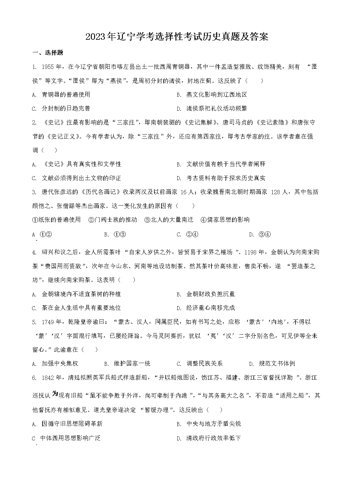 2023年辽宁学考选择性考试历史真题及答案(Word版)10-12