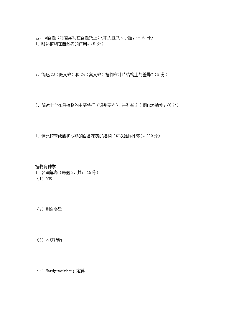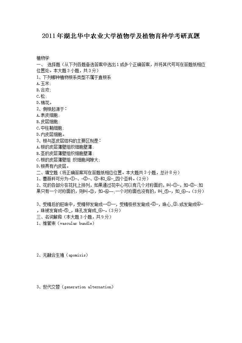 2011年湖北华中农业大学植物学及植物育种学考研真题(Word版)10-19