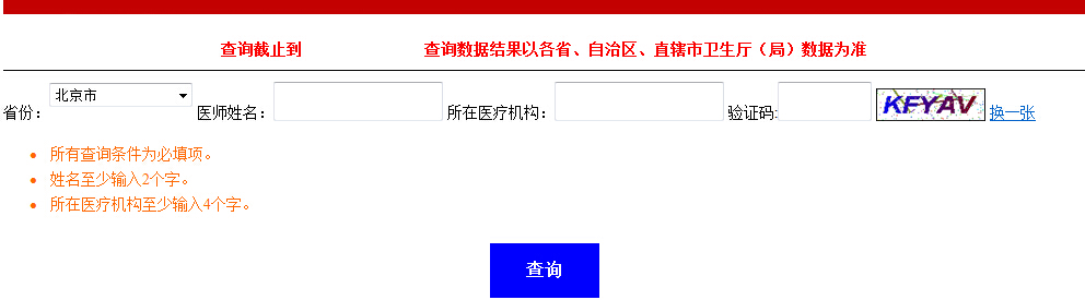 所有查询条件为必填项。 姓名至少输入2个字。 所在医疗机构至少输入4个字。