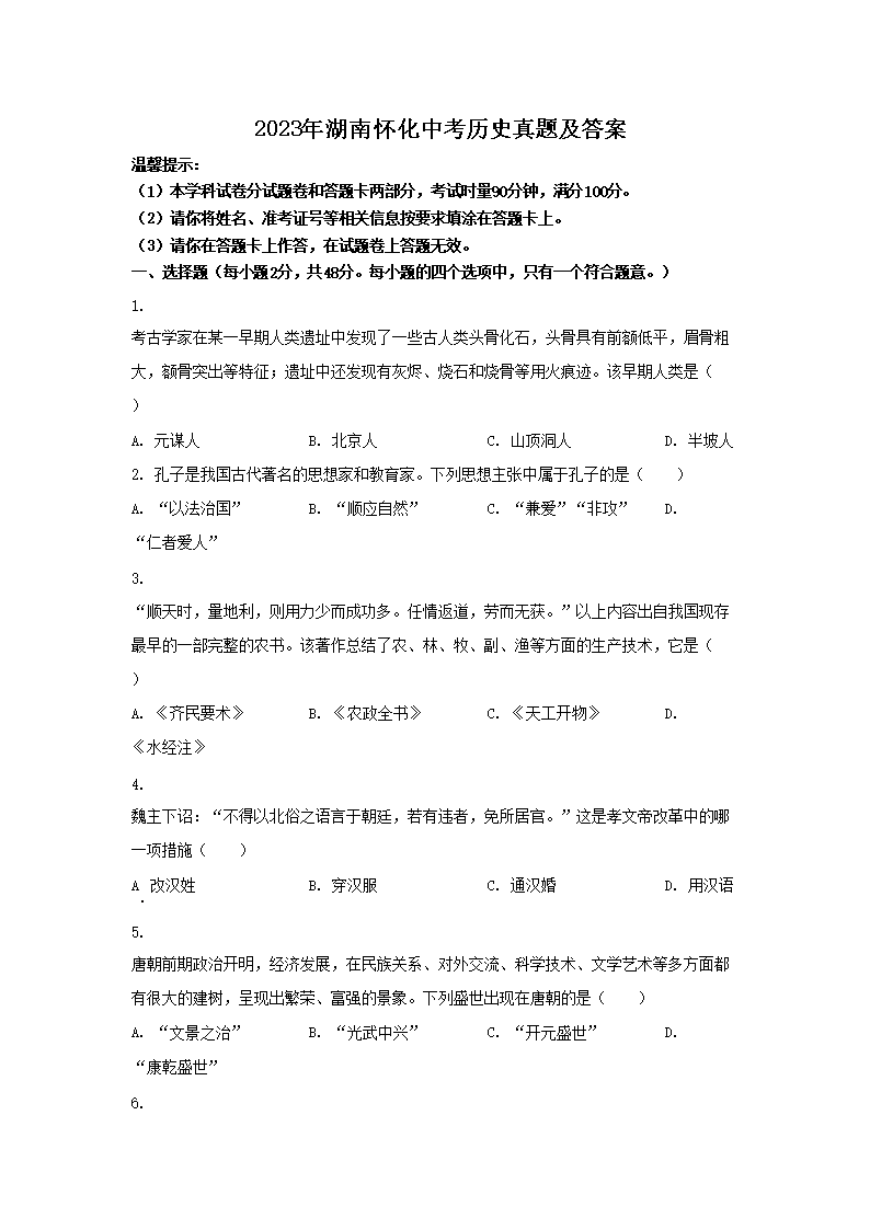 【文档预览】 文档大全网整理发布2023年湖南怀化中考历史真题及答案(Word版),前五页预览如下:
