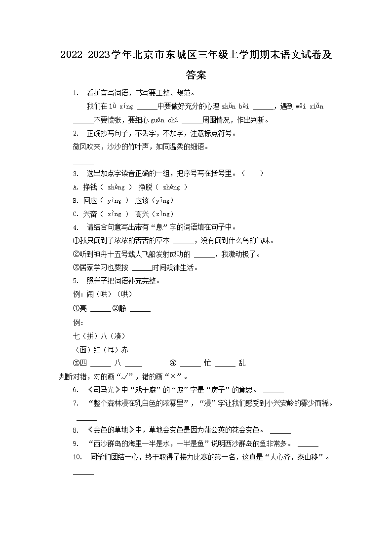 【文档预览】 文档大全网整理发布2022-2023学年北京市东城区三年级上学期期末语文试卷及答案(Word版),前五页预览如下: