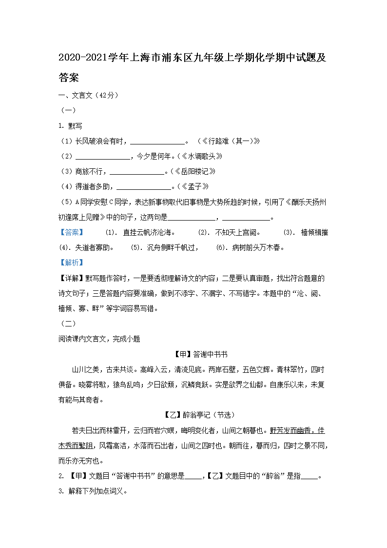 2020-2021学年上海市浦东区九年级上学期化学期中试题及答案(Word版)10-20