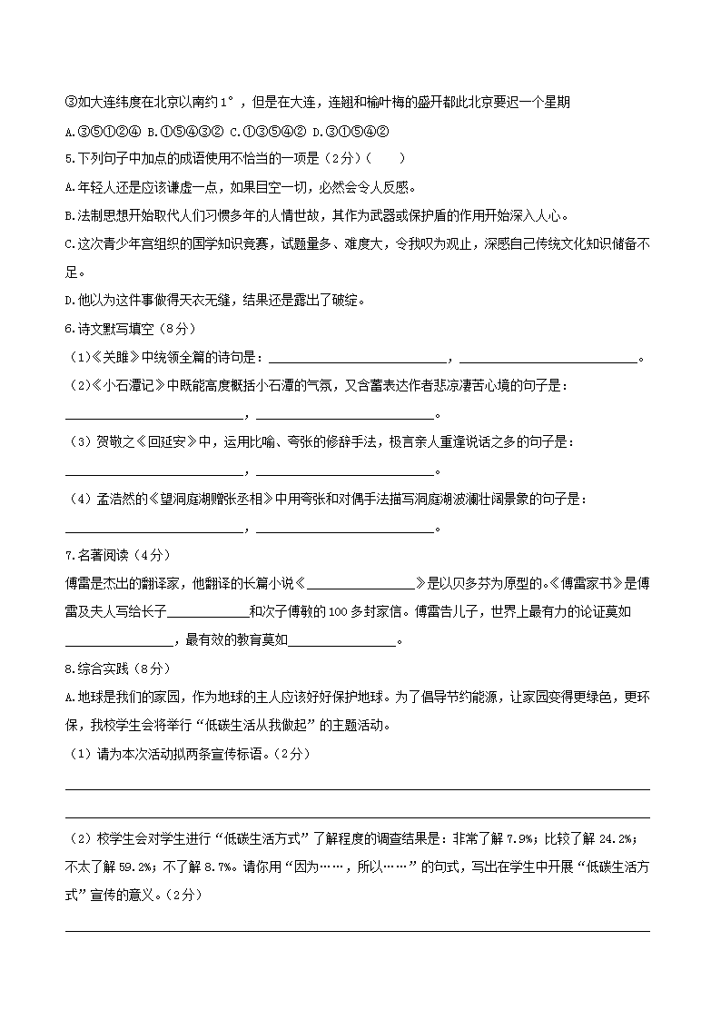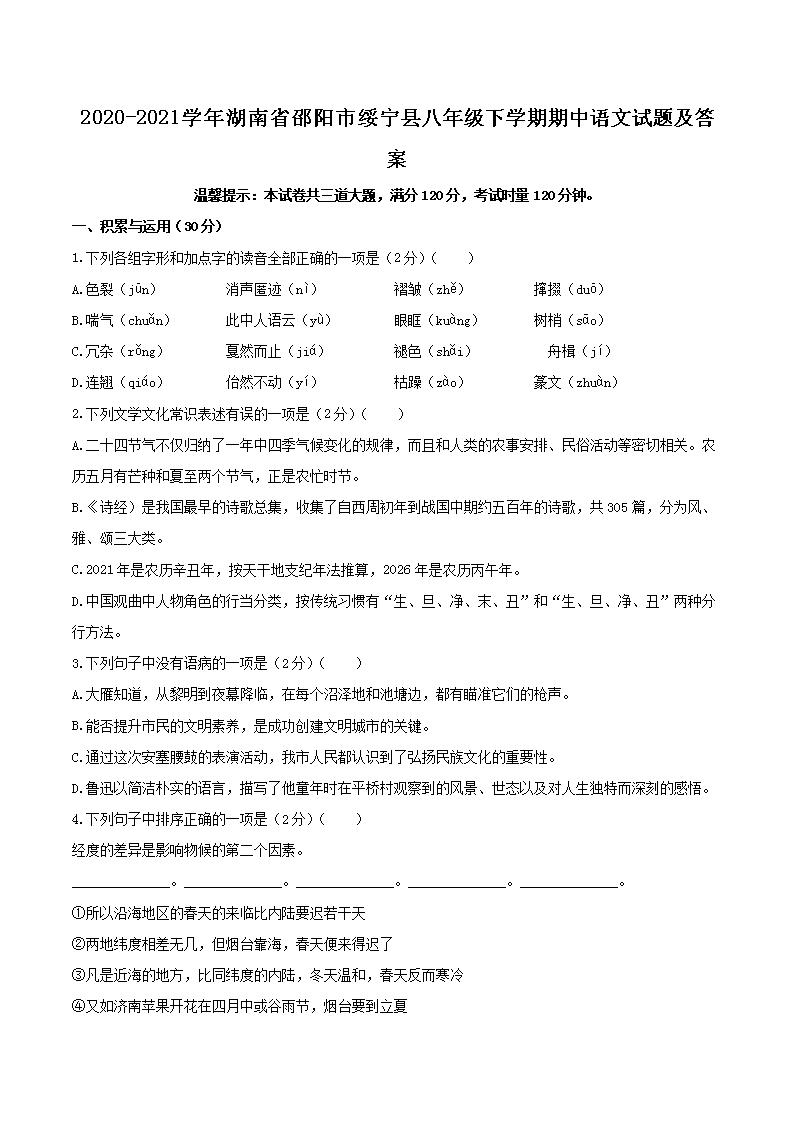 2020-2021学年湖南省邵阳市绥宁县八年级下学期期中语文试题及答案(Word版)10-25