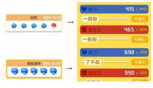 普通料理的食材分为三个等级,使用越高级的食材,则料理的味道越好,同时也更容易吸引到稀有的宝可梦。