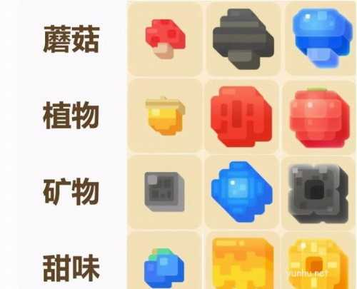 所有的食材都拥有三种属性,其中质地和稀有度属于公开信息一眼可见,而类别则需要你去尝试才能测出,分类如下:
