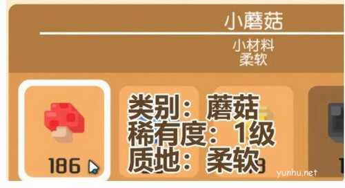 以小蘑菇为例,它有三个属性,分别为:稀有度1级,类别蘑菇,质地柔软。