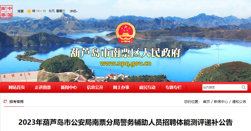 【#招警考试# #2023年辽宁葫芦岛市公安局南票分局警务辅助人员招聘体能测评递补公告#】®文档大全网从南票区人民政府了解到,2023年辽宁葫芦岛市公安局南票分局警务辅助人员招聘体能测评时间:10月19日,相关事宜详情如下: