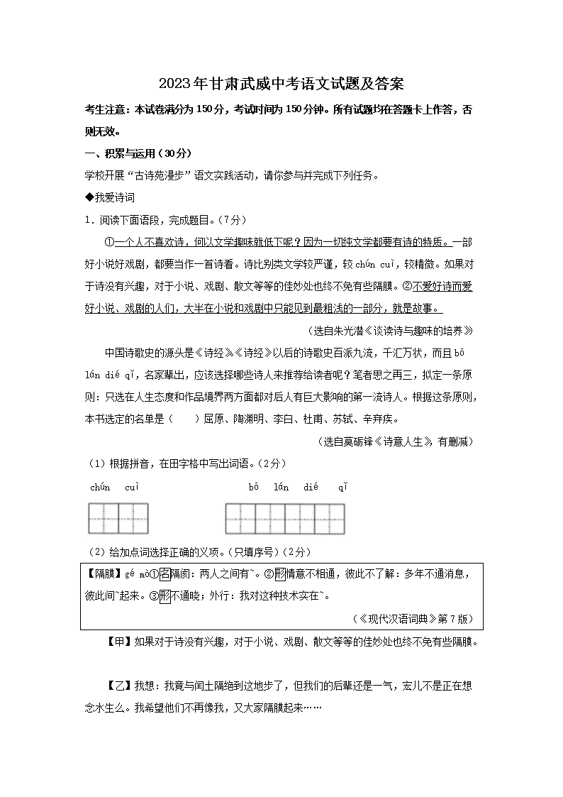 2023年甘肃武威中考语文试题及答案(Word版)06-20