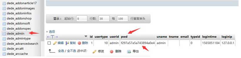 打开网站里的数据库,打开数据库中的 dede_admin 这个管理员表,找到表中管理员这条记录,找到pwd这个字段,把它的值改成