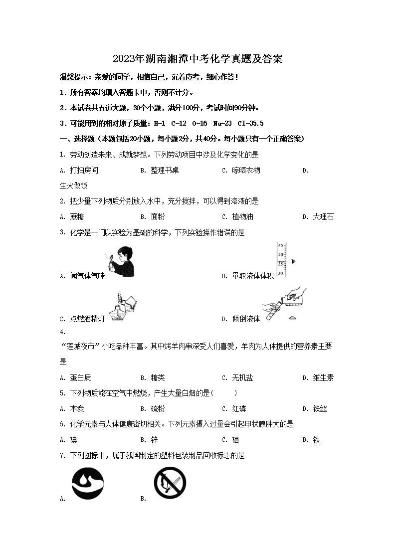 【文档预览】 文档大全网整理发布2023年湖南湘潭中考化学真题及答案(Word版),前五页预览如下: