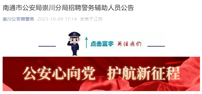 【#招警考试# #2023年江苏南通市公安局崇川分局招聘警务辅助人员公告(50人)#】®文档大全网从崇川公安微警务了解到,2023年江苏南通市公安局崇川分局招聘警务辅助人员50人,相关事宜详情如下:
