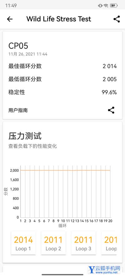 在偏重 GPU 性能的 3DMark wild life stress 中,COOL 20 Pro 获得了最高 2014 分,最低 2005 分的成绩,稳定性 99.6%,即便是长时间的性能输出也几乎没有降频,可见天玑 900 的发热是相当之低。