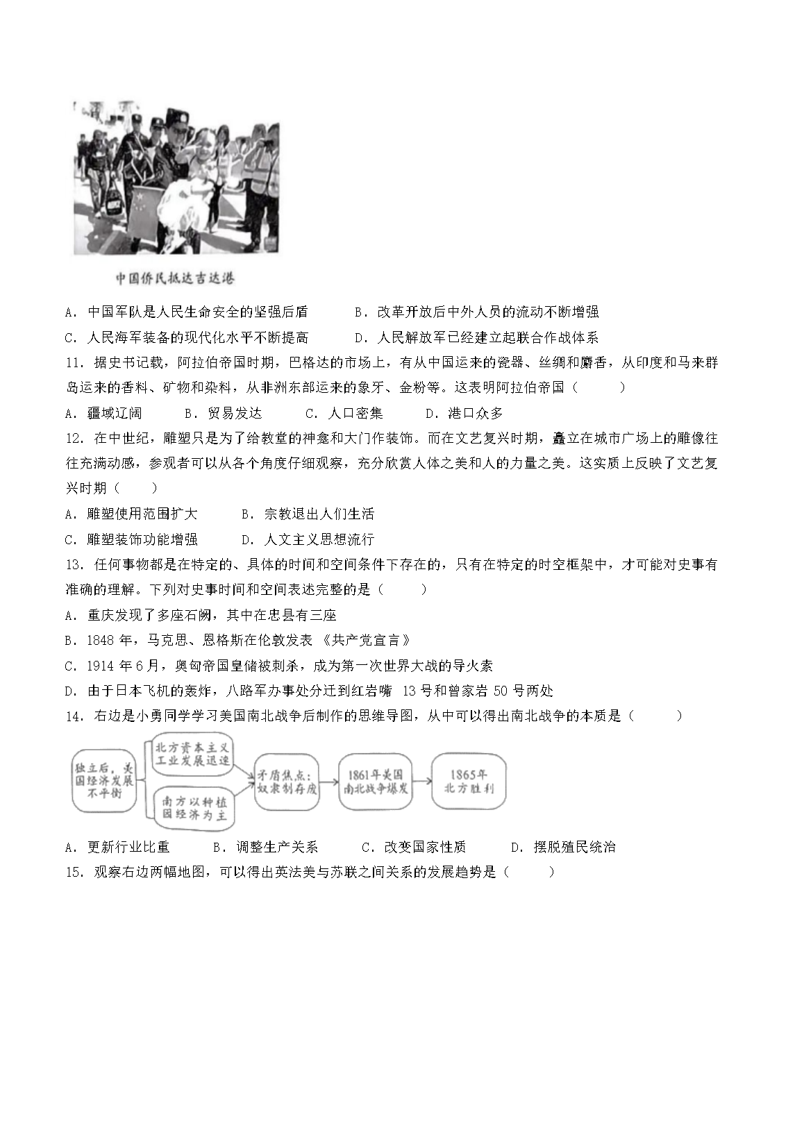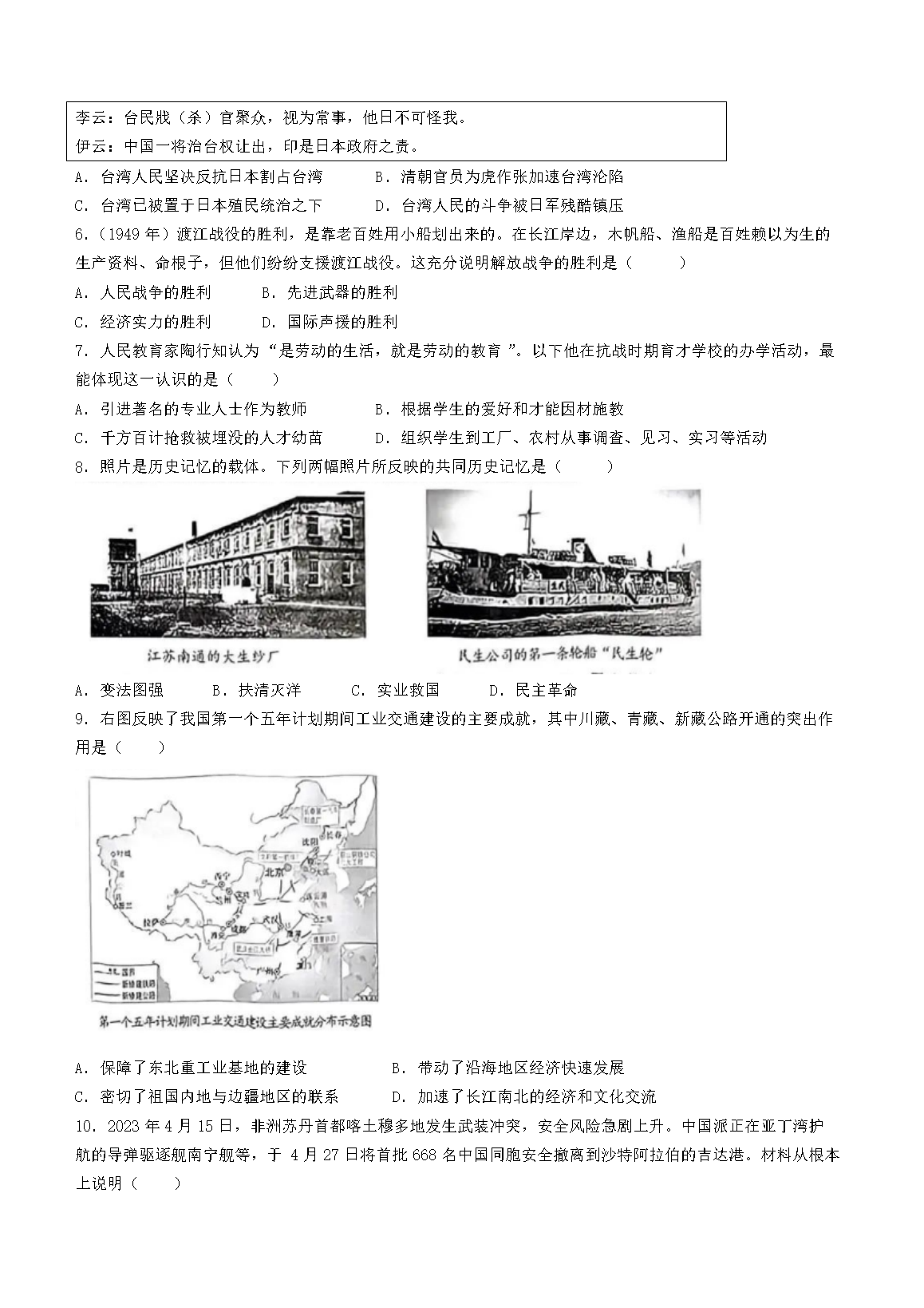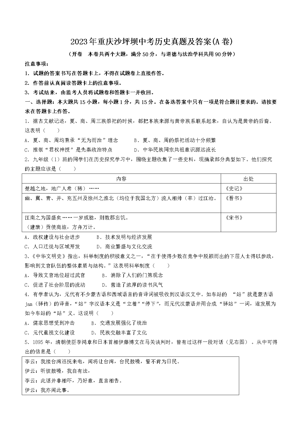 2023年重庆沙坪坝中考历史真题及答案(A卷)(Word版)06-15