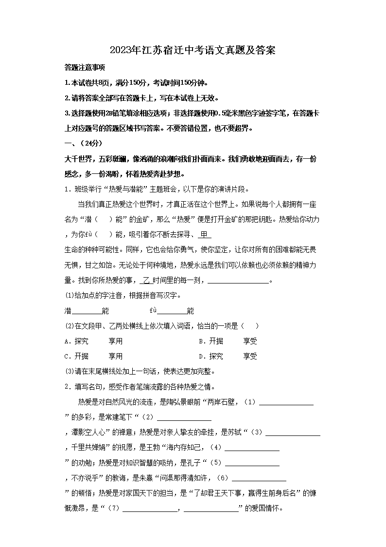 2023年江苏宿迁中考语文真题及答案(Word版)10-17