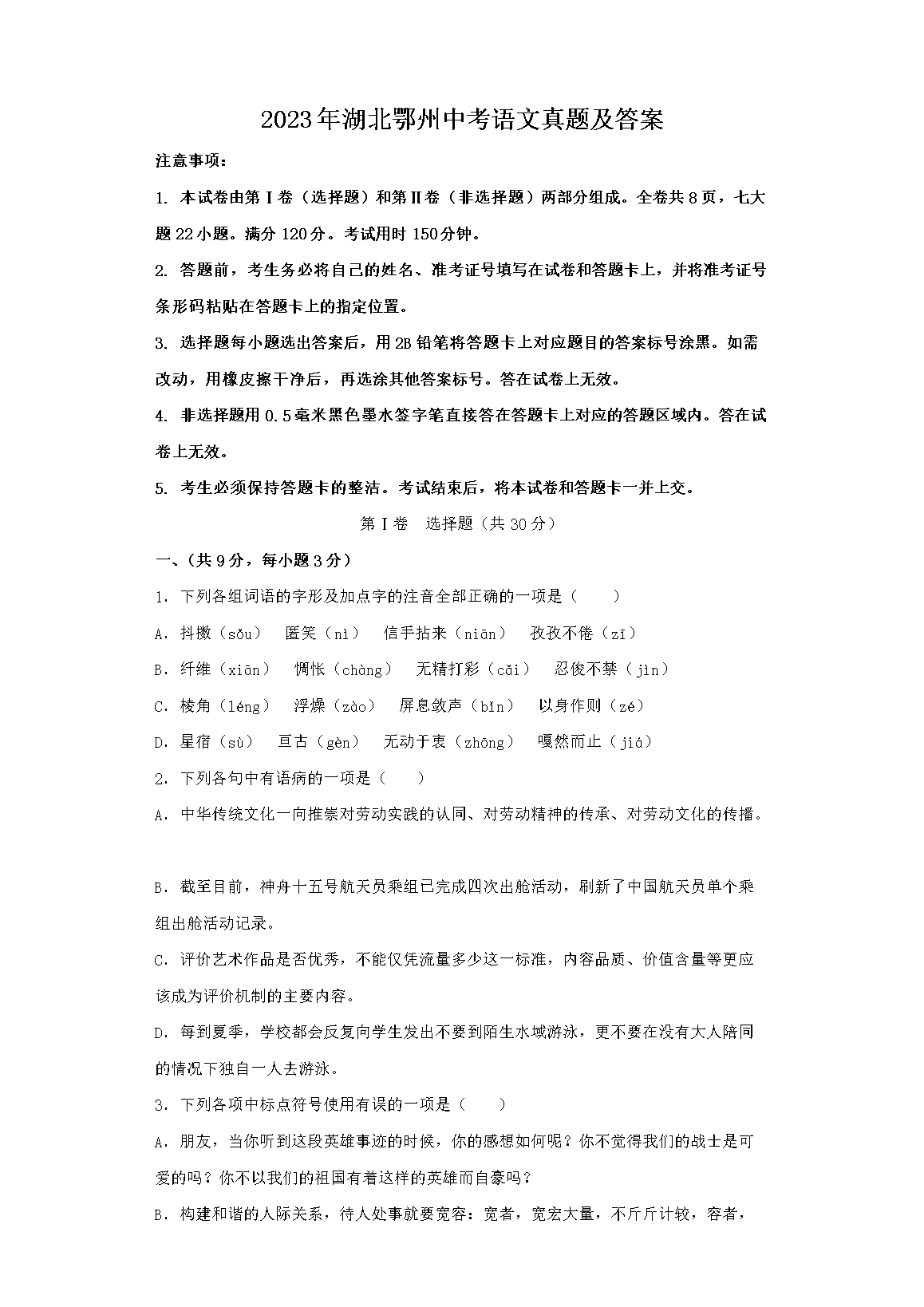 2023年湖北鄂州中考语文真题及答案(Word版)07-12