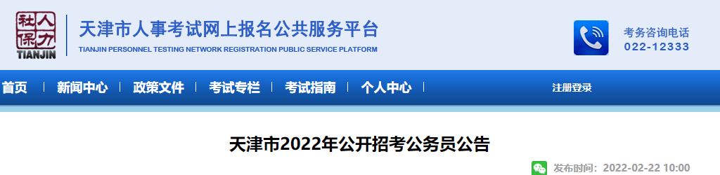 【#公务员考试# 导语】©文档大全网从天津市人事考试网获悉,2022年天津考试录用公务员报考工作现已开始,报名时间:2月23日-28日,考试时间:3月26日-27日,更多事宜请参考阅读《考试公告》,官方公告原文如下: