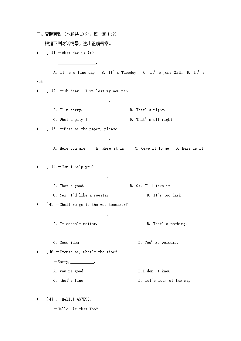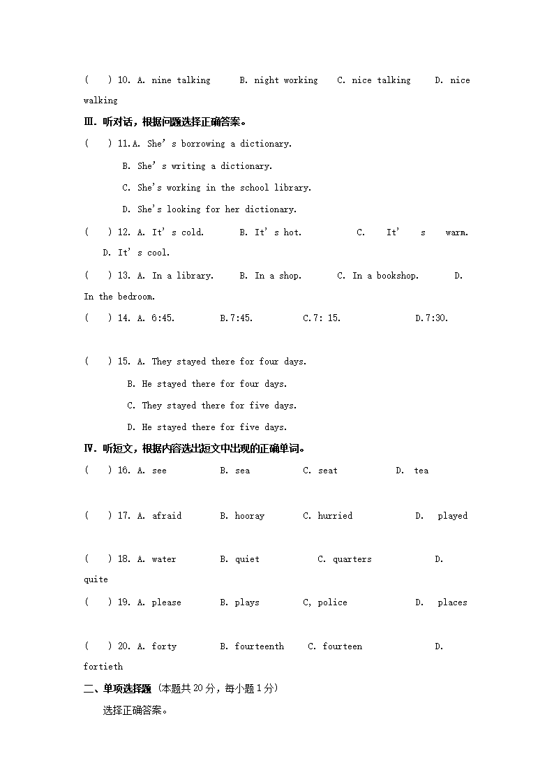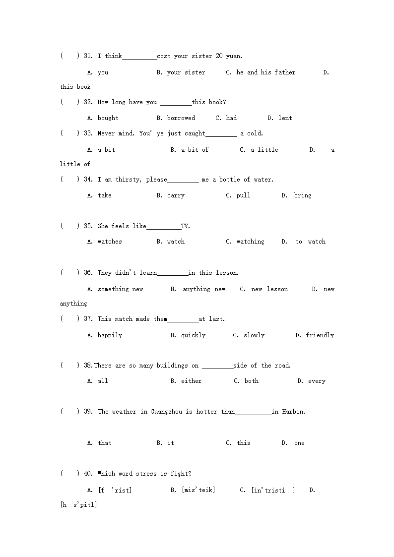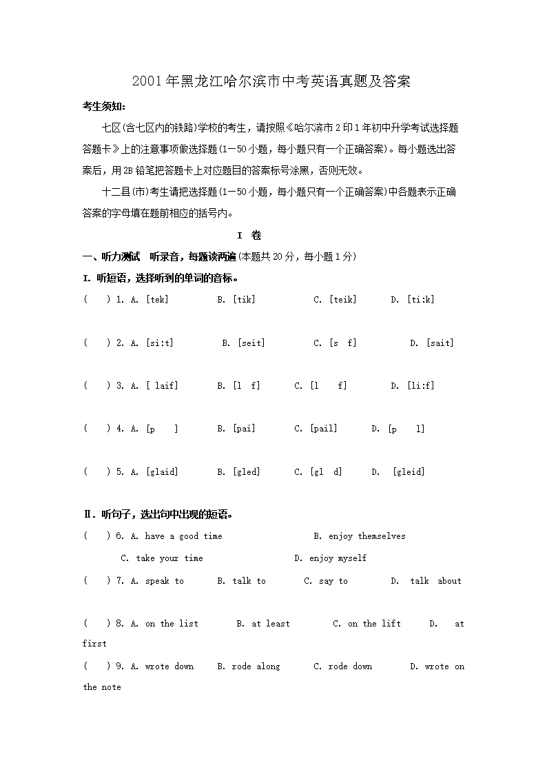 2001年黑龙江哈尔滨市中考英语真题及答案(Word版)06-07