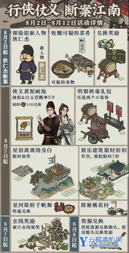-【侠义黄泥画池】开启!天级居民【展昭】、侯级居民【白玉堂】概率提升。可消耗150黄泥直接兑换【展昭】,并且可以抽取展昭专属珍宝。