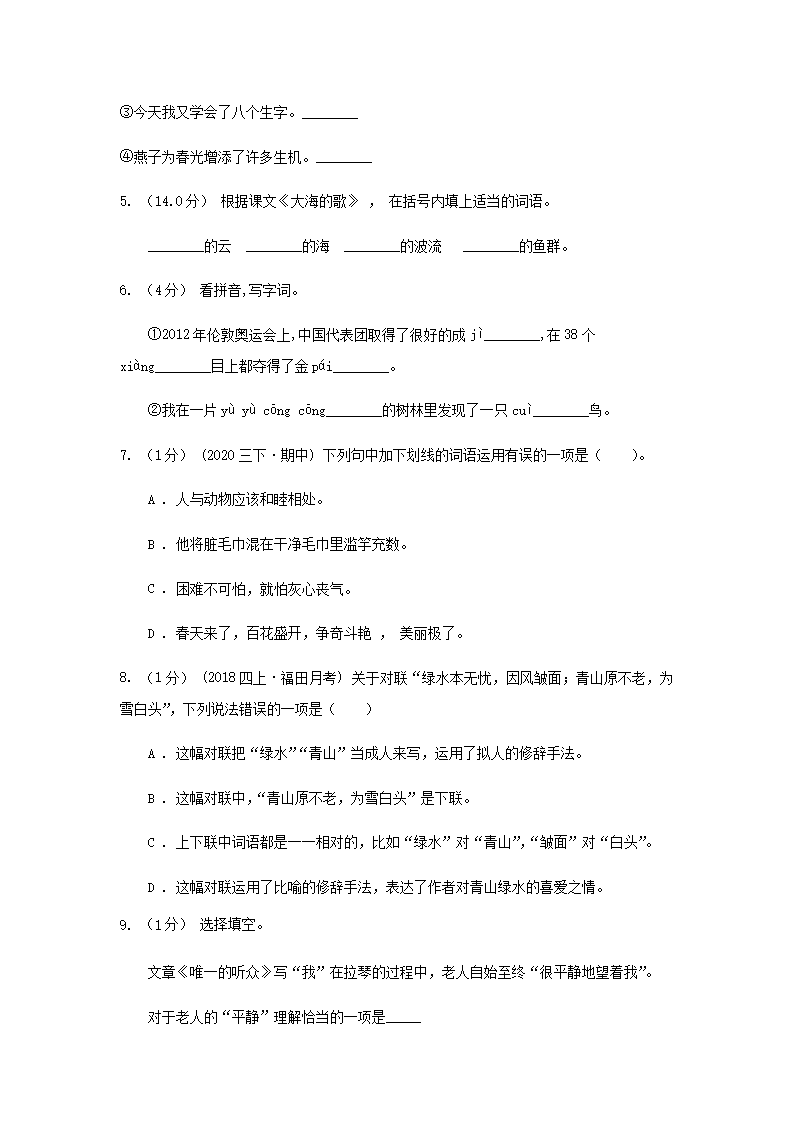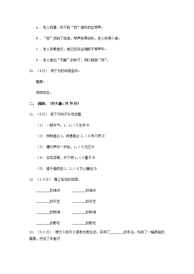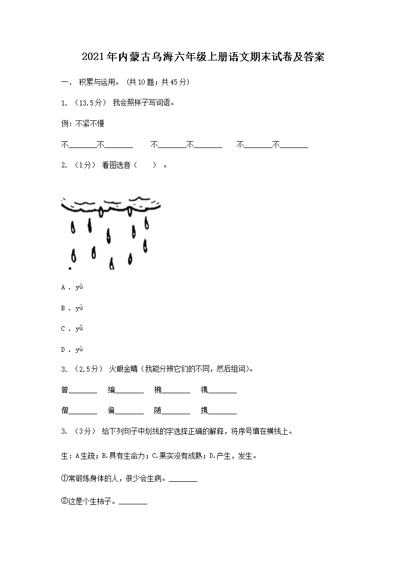 2021年内蒙古乌海六年级上册语文期末试卷及答案(Word版)06-30