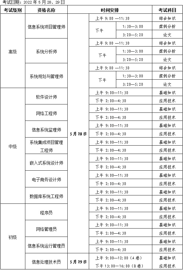 2022年上半年全国计算机技术与软件专业技术资格(水平)考试时间安排