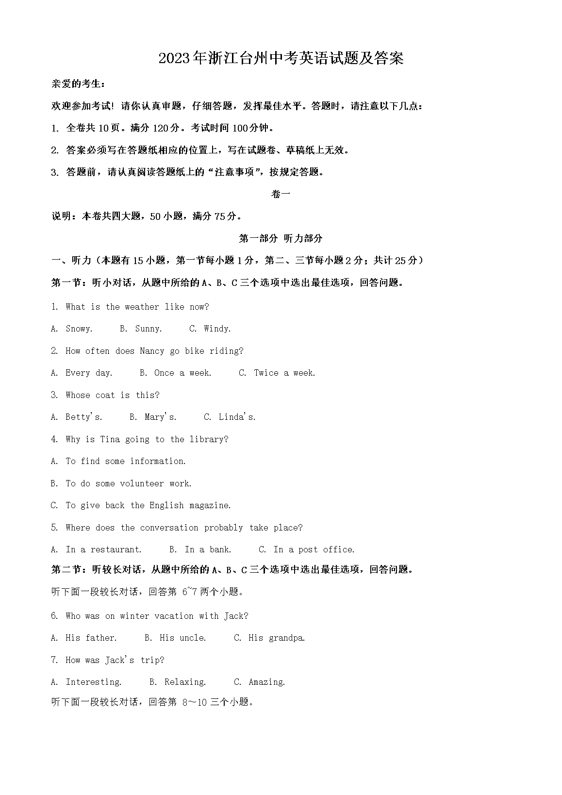 【文档预览】 文档大全网整理发布2023年浙江台州中考英语试题及答案(Word版),前五页预览如下: