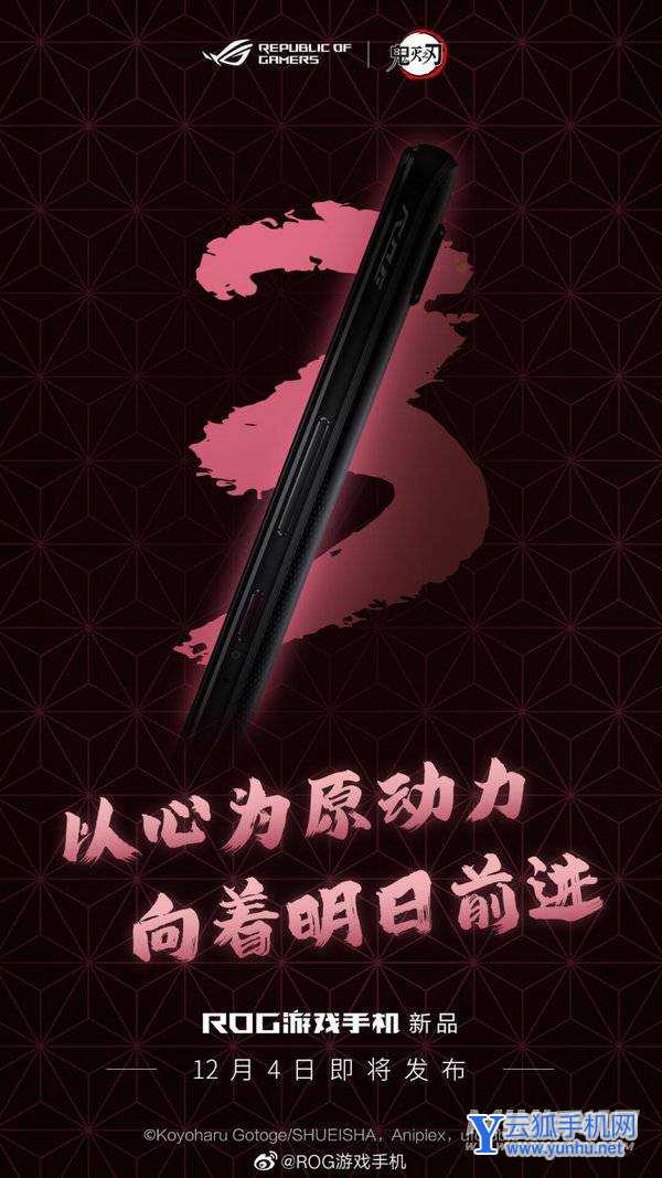 小编 12 月 1 日消息,ROG 游戏手机官方今日宣布,ROG 游戏手机新品发布会定档 12 月 4 日,而且从宣传海报来看还将会与《鬼灭之刃》进行联名,届时将为大家带来惊喜。