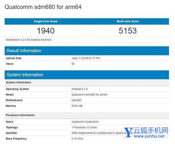 就单核的跑分就超过了骁龙710,相比于骁龙660的跑分成绩,骁龙680单核性能提升20%,多核性能提升10%,主频为2.15GHz的六核心架构,10nm工艺制程,极可能2个大核心+4个小核心,运行安卓8.1.0 Oreo,并配置5.5GB运存。