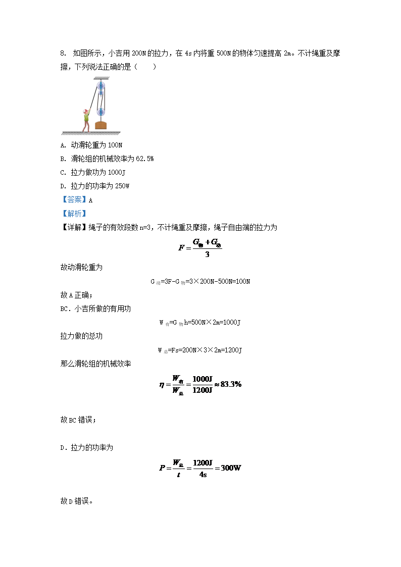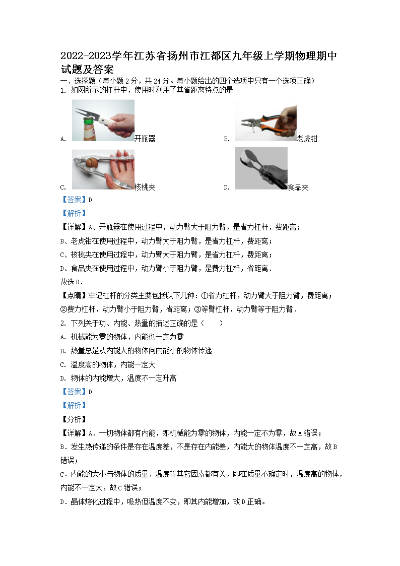 2022-2023学年江苏省扬州市江都区九年级上学期物理期中试题及答案(Word版)10-17