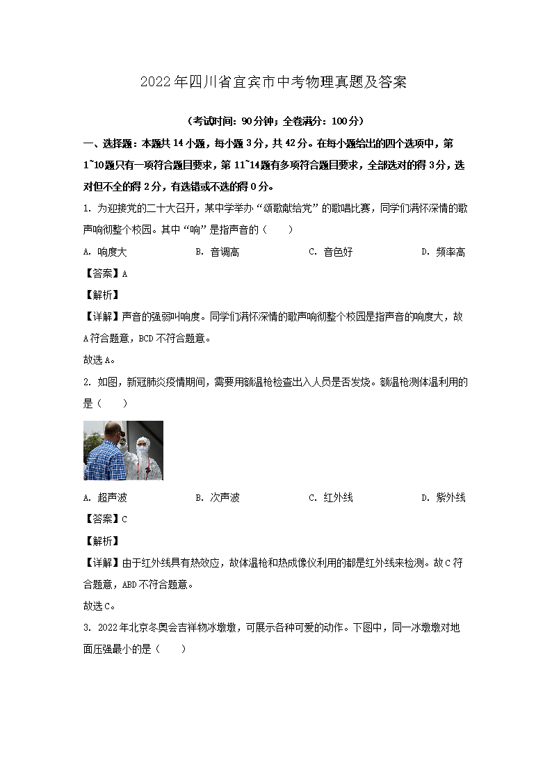 【文档预览】 文档大全网整理发布2022年四川省宜宾市中考物理真题及答案(Word版),前五页预览如下: