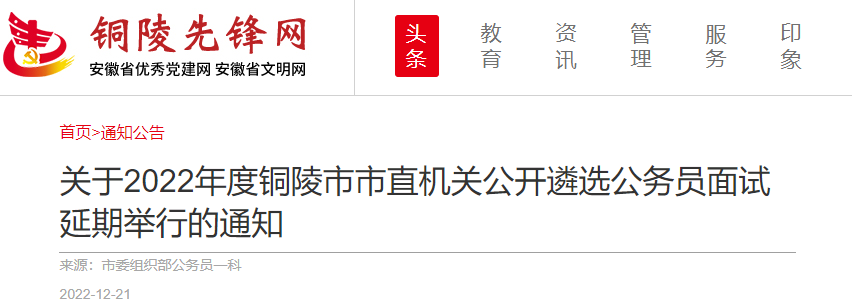 根据当前疫情形势,经研究,原计划于12月24日举行的2022年度铜陵市市直机关公开遴选公务员面试延期举行,具体时间另行通知。