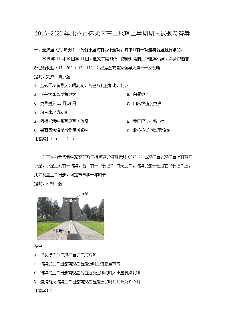 2019-2020年北京市怀柔区高二地理上学期期末试题及答案(Word版)09-26