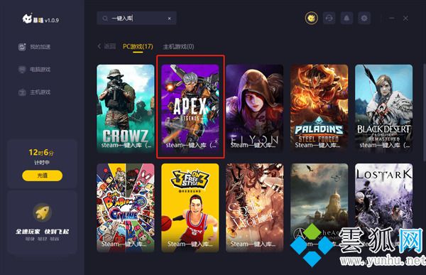 1、使用暴喵加速器搜索“一键入库”,可以看到这些游戏都是steam锁区的,并且可以通过暴喵一键入库下载的,然后选择steam一键入库apex加速;