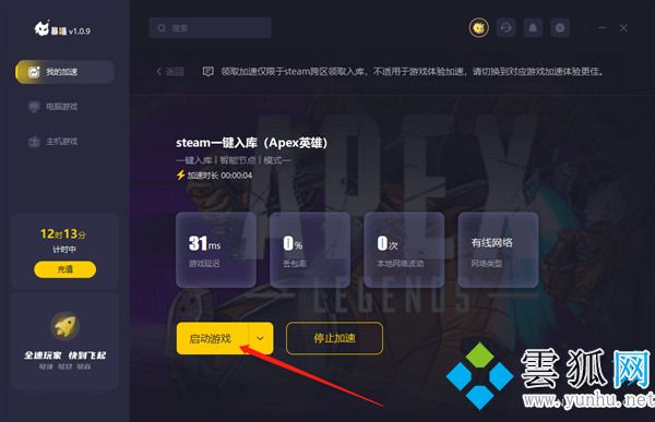 2、加速后,点击启动游戏即可安装游戏,如果是弹出steam客户端登录窗口是因为你没打开steam,请登录后再重复上面的操作。
