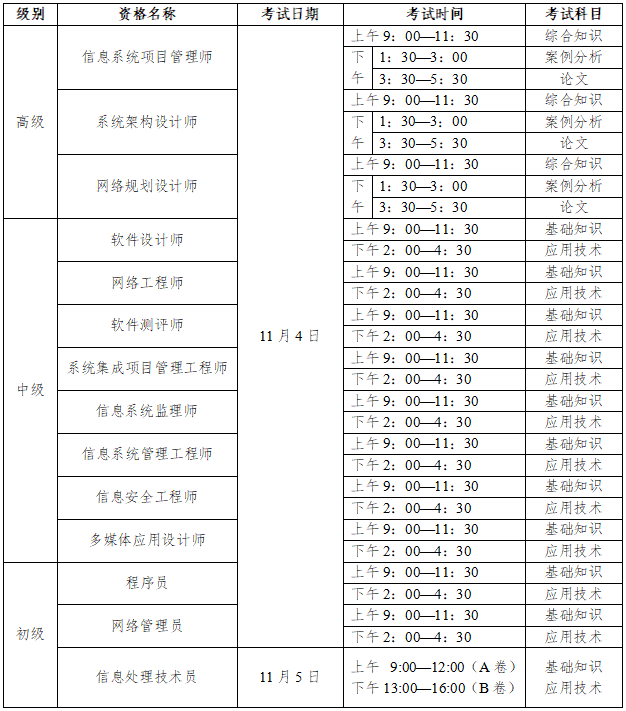 2023下半年北京软考时间:11月4日-5日