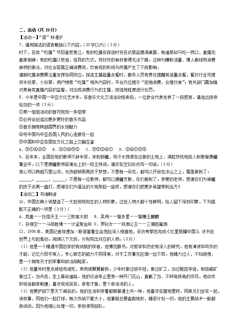 2023年新疆乌鲁木齐中考语文真题及答案(Word版)06-26