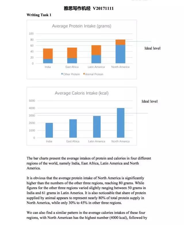 小作文:两柱形图,比较四个国家蛋白质和卡路里摄入