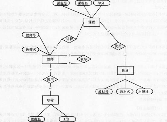 E-R图也称实体一联系图,提供了表示实体类型、属性和联系的方法,用来描述现实世界的概念模型。为了简化E-R图的处置,现实世界的事物能作为属性对待的,尽量作为属性对待。实体与属性的划分给出如下两条规则:①作为“属性”,不能再具有需要描述的性质,“属性”必须是不可分的数据项,不能包含其它属性。②“属性”不能与其它实体有联系,即E-R图中所表示的联系是实体之间的联系。题目中教师与课程有讲授关系,课程和教材有使用关系,教师与职称有聘用关系。
