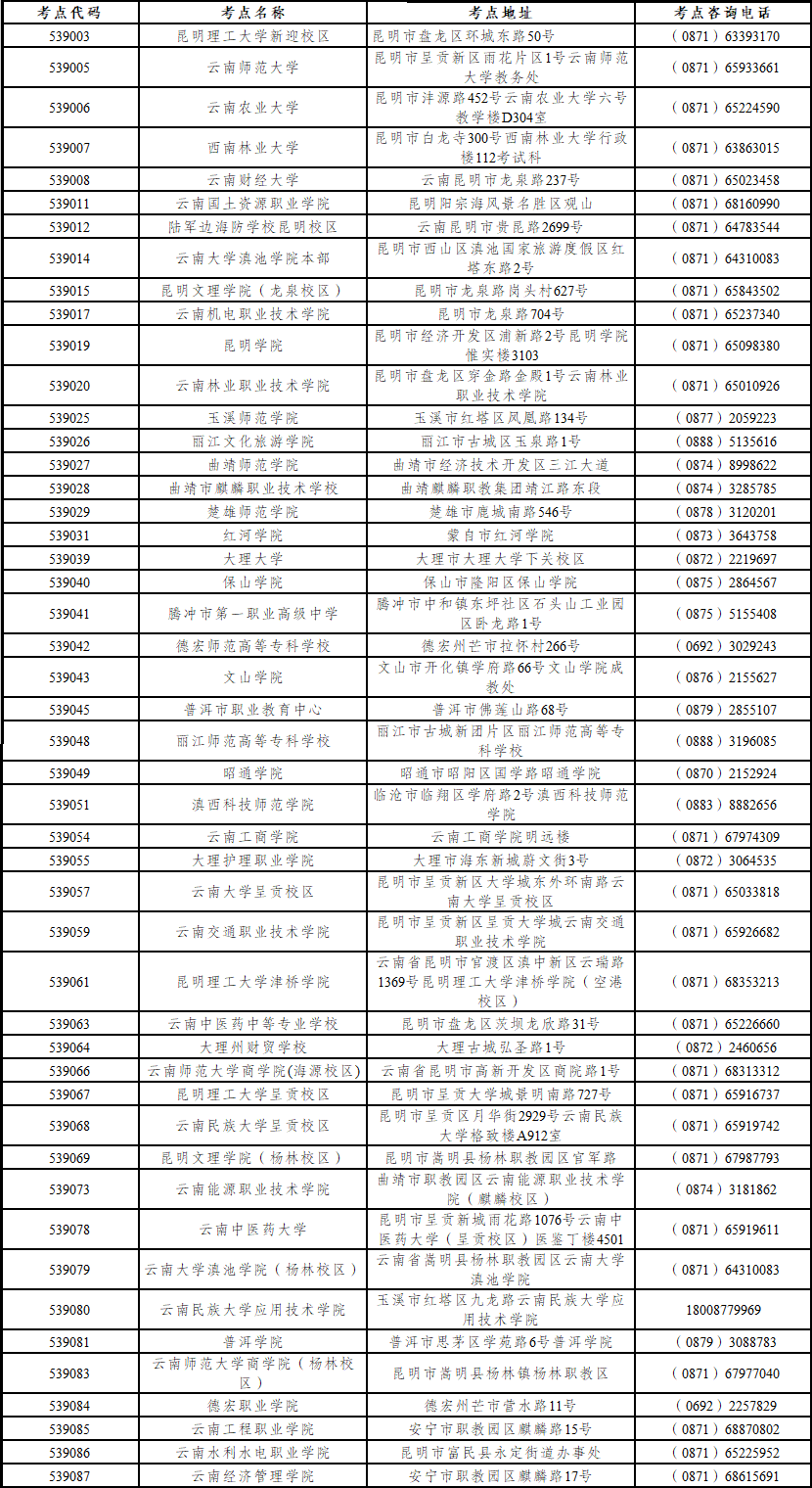 注:本次考试昭通学院、云南中医药中等专业学校、大理州财贸学校、云南师范大学商学院(杨林校区)、云南水利水电职业学院等5个考点接受外校考生报考,其他考点只接受本校在校生报考。