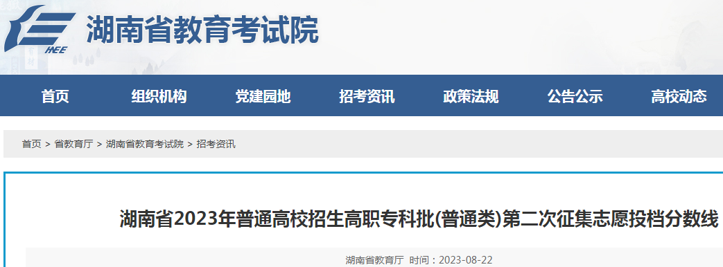 湖南省2023年高职专科批(普通类)第二次征集志愿投档分数线公布08-23