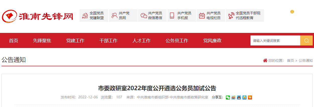 2022年安徽淮南市委政研室公开遴选公务员加试时间:12月10日12-08