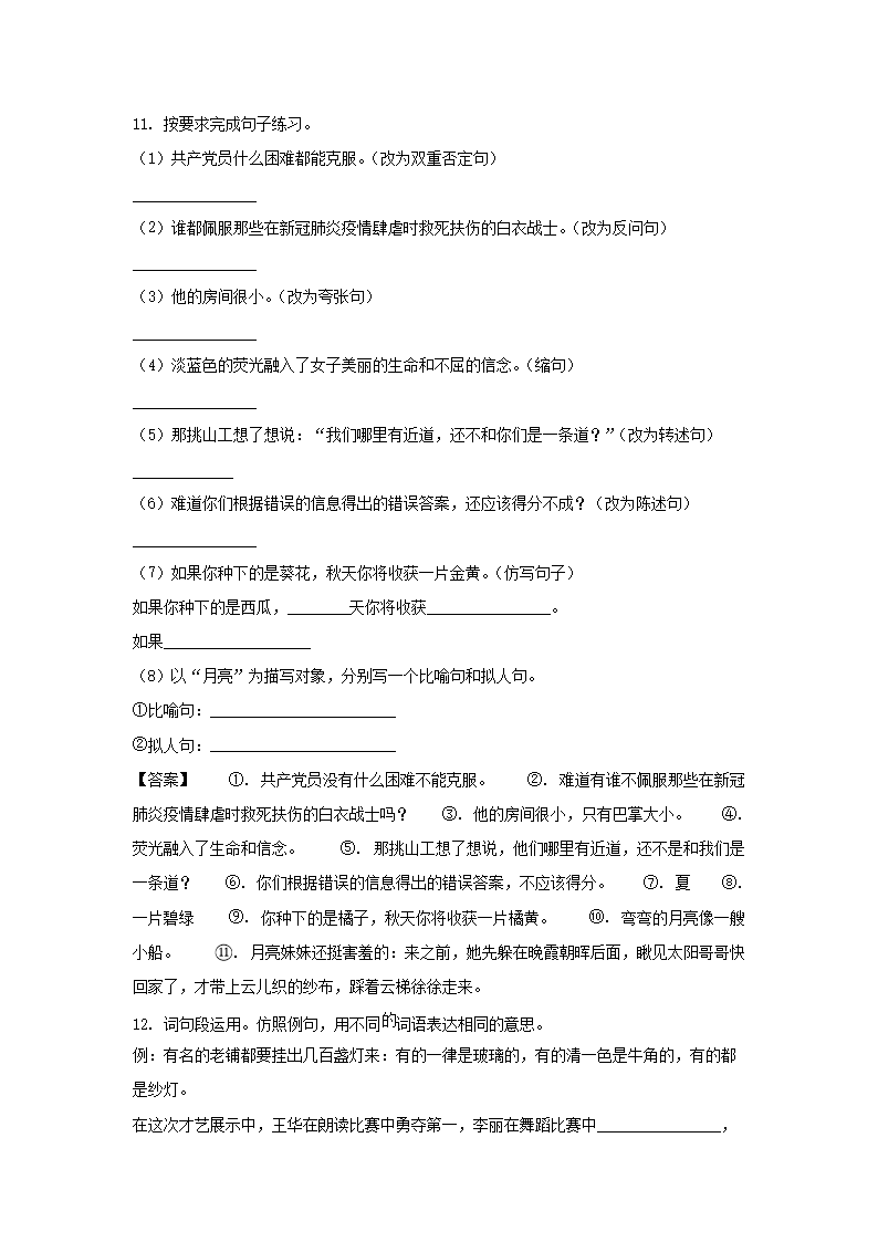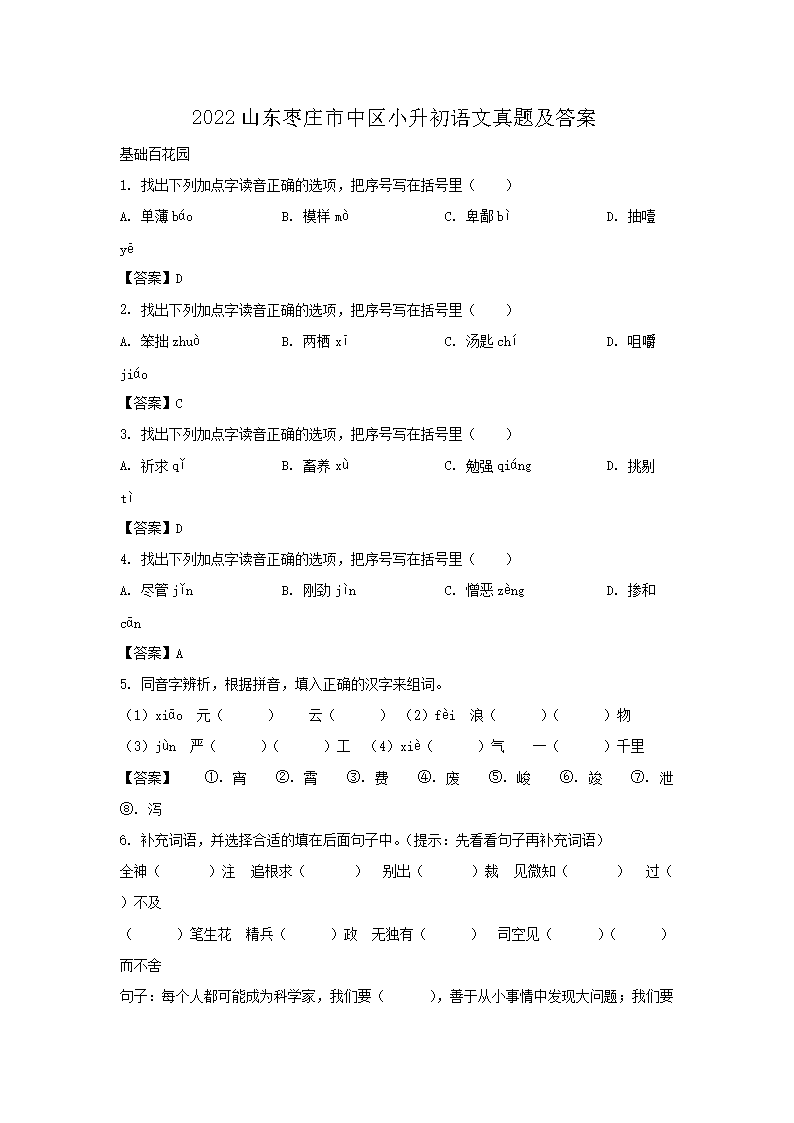 【文档预览】 文档大全网整理发布2022山东枣庄市中区小升初语文真题及答案(Word版),前五页预览如下: